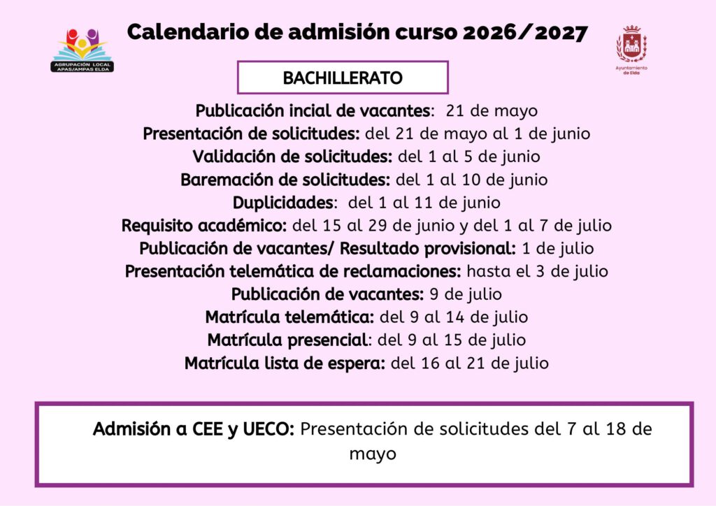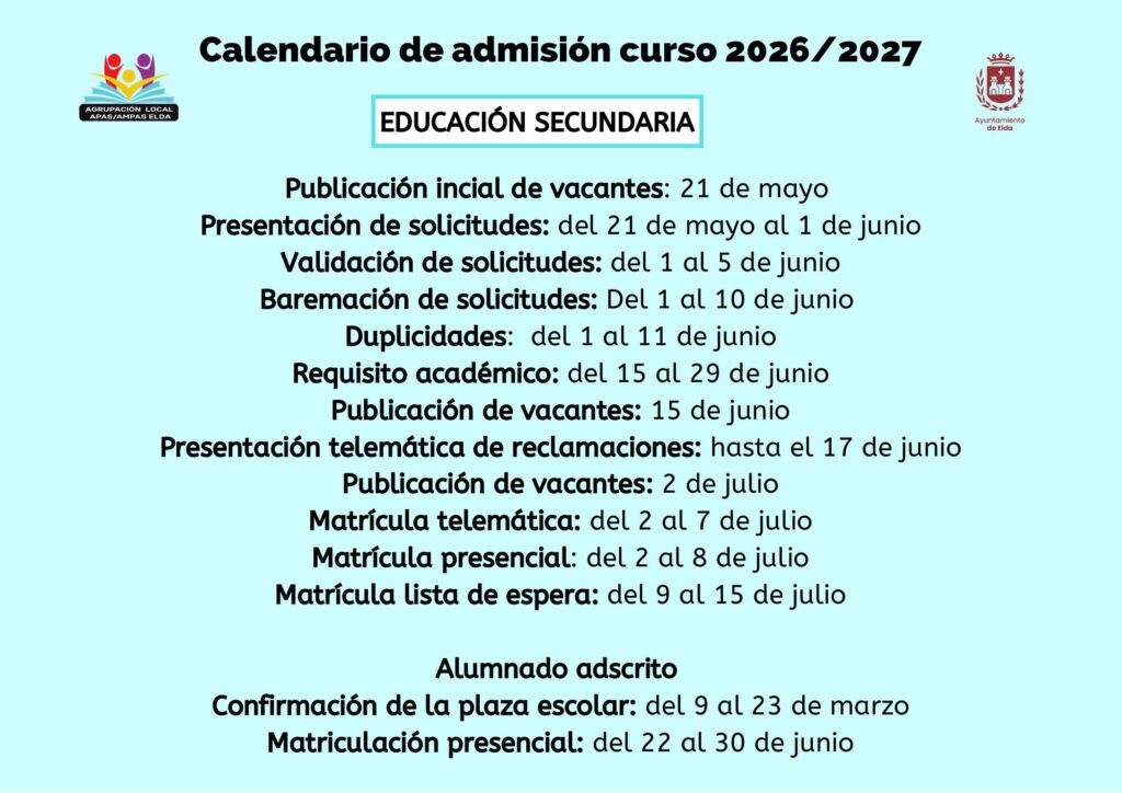 CALENDARIO Ya está disponible los calendarios de admisión para el curso 2026-2027 para las enseñanzas de educación infantil, educación primaria, educación secundaria obligatoria, bachillerato y formación profesional en la Comunitat Valenciana. Decreto de Conselleria